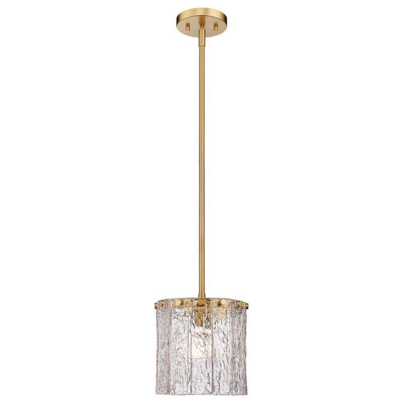Gleaming gold metal offers an incomparable reflective quality to clear glass, adding a striking look to this exquisite light fixture. The Glacier one-light pendant delivers glam individual clear textured glass panels that emulate melting ice, an extraordinary effect with dramatic impact in a foyer, dining room, or nook. Modern gold finish steel is placed as a crown frame, adding a contrast in both style and finish and embellishing the optical delight accomplished when the fixture is illuminated.