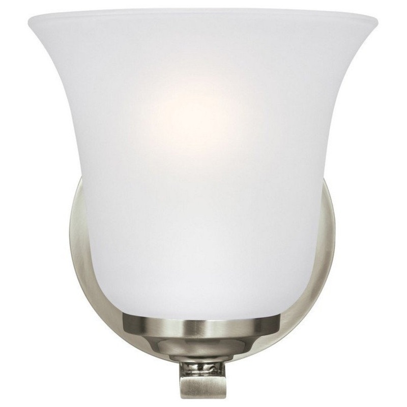 1 Light Wall Bath Sconce-Brushed Nickel Finish-LED Lamping Type . The The Approach lighting collection by Bailey Street Home Lighting combines form and function in a traditional empire silhouette. Trumpeted Satin Etched glass shades and a circular finial further enhance the design. Cluster three sizes together in a multi-fixture installation to make a beautifully dramatic statement in the living room foyer entryway or family room. The The Approach collection comes in two finishes: Brushed Nickel and Bronze. Its assortment includes three- five- and nine-light chandeliers; one-light mini pendant three-light pendant two-light semi-flush mount; one-light wall sconce; and two- three- and four- light bath vanity fixtures. Incandescent and ENERGY STAR-qualified LED lamping are available; all fixtures are California Title 24 compliant.