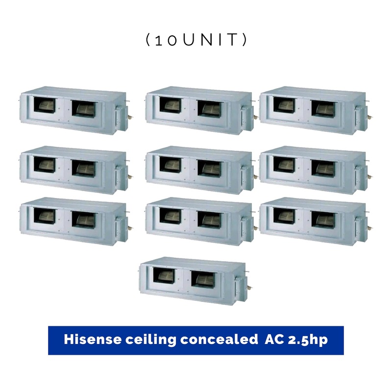 This Combo package contains Hisense 2.5hp Ceiling Concealed Air Conditioner HIS CEIL CONC 2.5HP 10 unit2.5 HP Ceilling ConceiledInverterR410 GasWhite ColorAir Conditioner Type: Inverter Ceiling ConcealedGas Type: R410Inverter TechnologyIndoor and Outdoor U