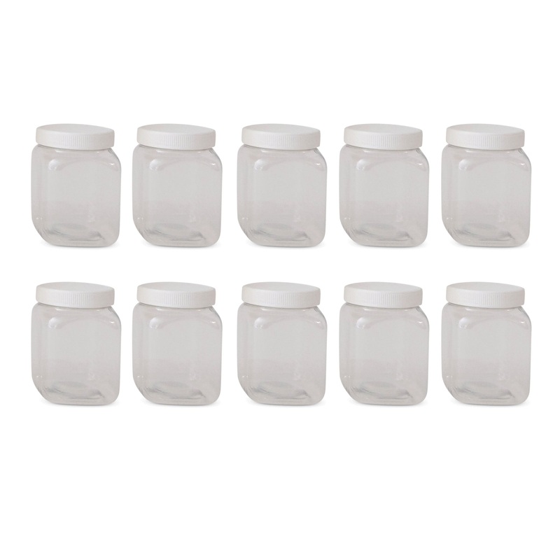 Squareplastic empty food grade jars with white lids, commonly used for packing food products and items such asbeads, crafts, decorations, honey, grains, beans etc.