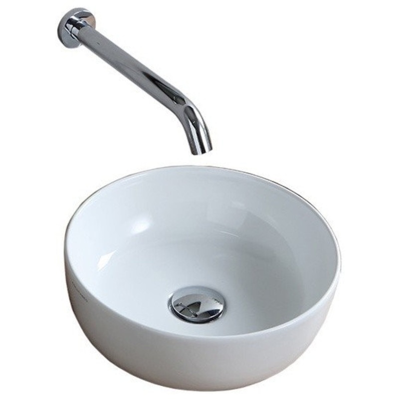 Round white bathroom sink made from high quality ceramic. Contemporary style sink in a vessel application. Available in no hole option. Part of the Scarabeo Glam collection. Made in Italy. Product Details: -Round white ceramic sink -Vessel application -Sin