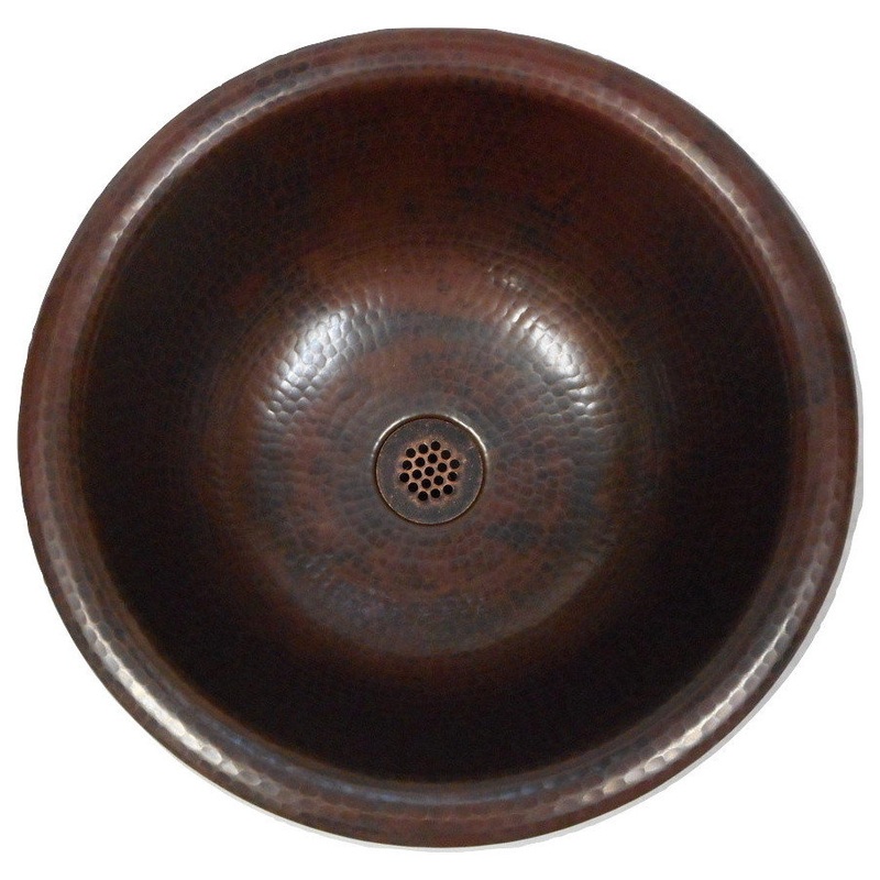 SimplyCopper 14 elegant round bowl design, created of 18-gauge copper which is hand-hammered to provide a rustic antiqued look. Perfect for small vanities or powder rooms, wine & whisky barrels. This copper sink is installed as a drop- in ..