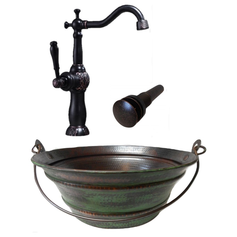 Discover the old-world beauty of our handmade copper sinks. Easy to care for, each sink is one of a kind. 15" Round Copper Bucket Sink with Copper and Green Patina Design, created of 18-gauge copper which is hand-hammered to provide a Rustic, Old-World Loo