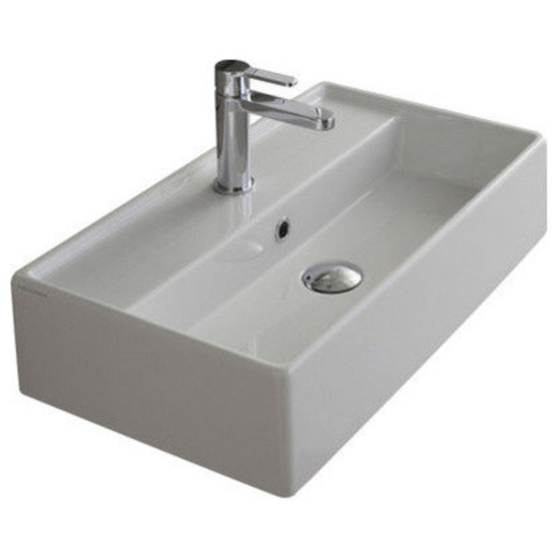 This beautiful white ceramic, contemporary style sink comes as either a countertop bathroom sink or as a wall hanging bathroom sink. It?s rectangular design comes in no hole, one hole, or three hole design overs versatile options in order to perfectly suit the needs of your bathroom.