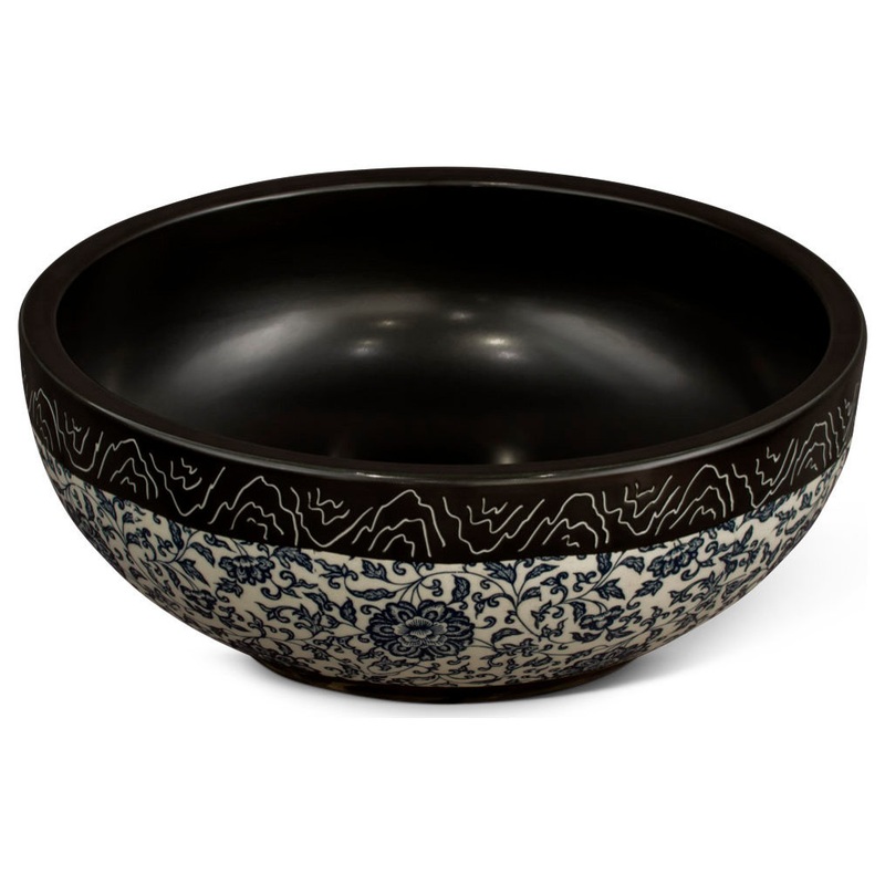 -The handcrafted process may result in slight color variation. No two are exactly alikeEnhance the appeal of your bathroom with our exquisitely designed modern Asian basins. This basin is meticulously crafted with a stunning blue and white blossom design on its outer surface. A black band in abstract form embellishes the top trim of the basin, while the exquisite matte black interior completes the overall elegant appearance. It measures 16 inches, making it a perfect fit for any vanity cabinet. The central drain hole, with a 1.75-inch diameter, is compatible with various hardware options. This basin not only provides practicality but also elevates the sophistication of your home. Please note that due to its handmade nature, the color may vary slightly.