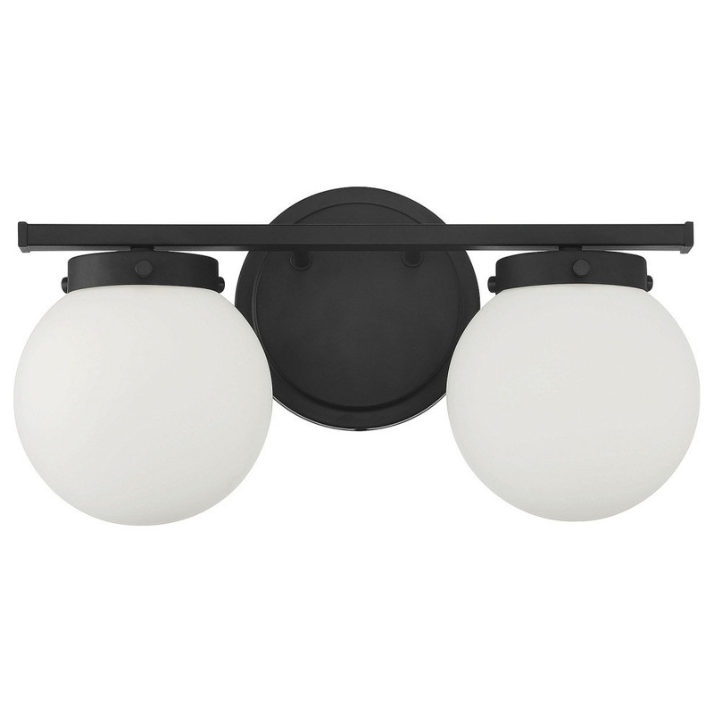 Add a bubbly look to your bath with this Meridian 2-light bath bar! Its streamlined design features globes of opal glass, a shape that is echoed in the circular backplate. This light will really pop in bathrooms with contemporary, modern and midcentury modern styles. Finished in matte black, it is also damp area rated. This bath light is 8 inches in height and 16 inches in width with a backplate that is 6 inches in diameter and 0.75 inch in depth. It extends 7.25 inches from the wall and can be mounted with the shades facing up or down. It uses 2 candelabra size bulbs of up to 60 watts each, is dimmable and is LED compatible. UL/CUL listed.