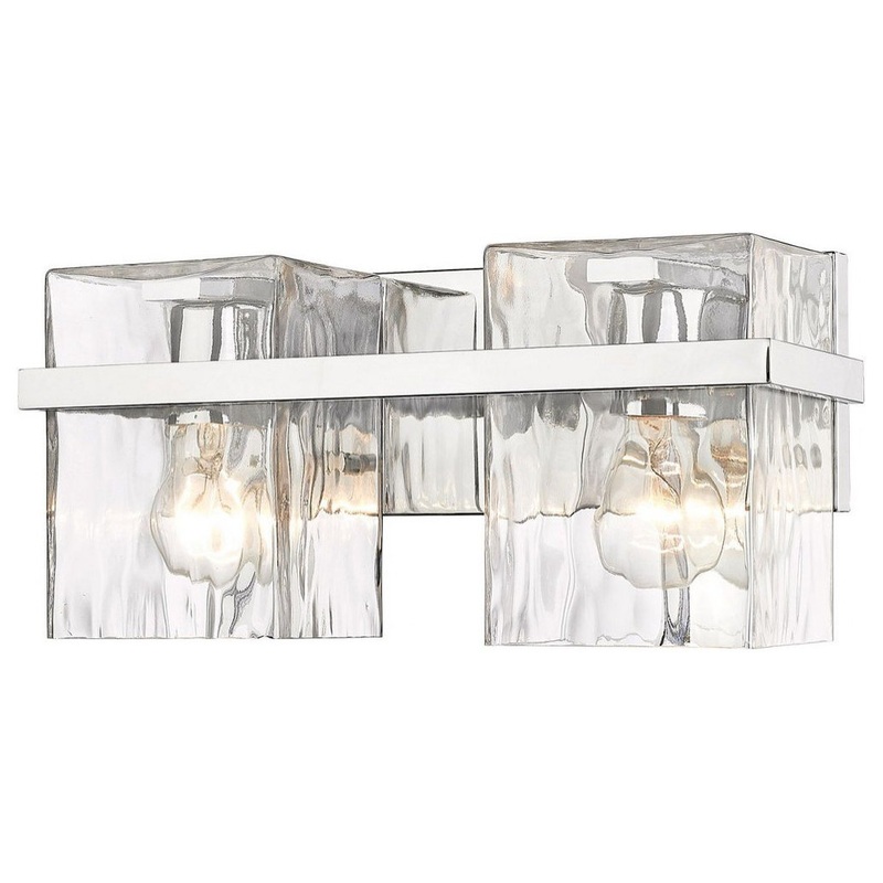 2 Light Farmhouse Steel Vanity Light Fixture with Clear Glass-7 Inches H by 14.25 Inches W-Chrome Finish . The Sandhurst Causeway Collection of bath fixtures highlights its handmade glass with a distinctive metal cuff for a unique artisanal appearance. A choice of rich finishes Modern Gold Brushed Nickel Matte Black and Chrome helps set the look apart.