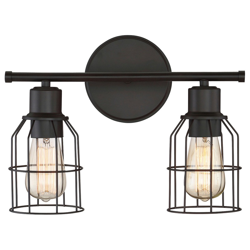 This industrial-style two-light vanity fixture offers thin wire cage shades over exposed light sources and an oil rubbed bronze finish.