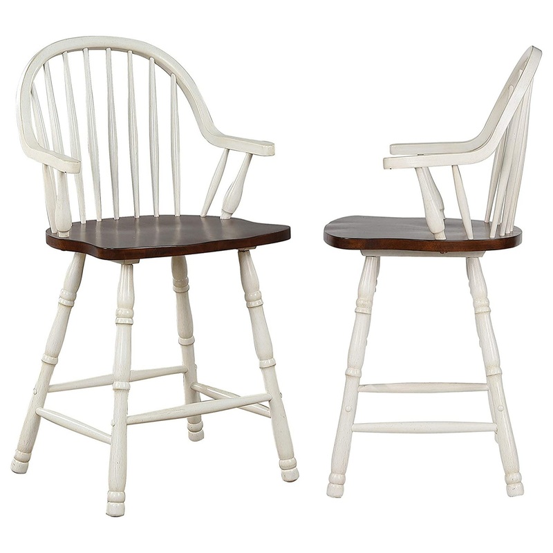 -Includes two counter height barstools with arms | Constructed from solid kiln dried Malaysian Oak also known as rubberwood -Attractive arched back with varied height spindle rods that flow to the stool arms | Comfortable sculpted seat | Turned angled legs