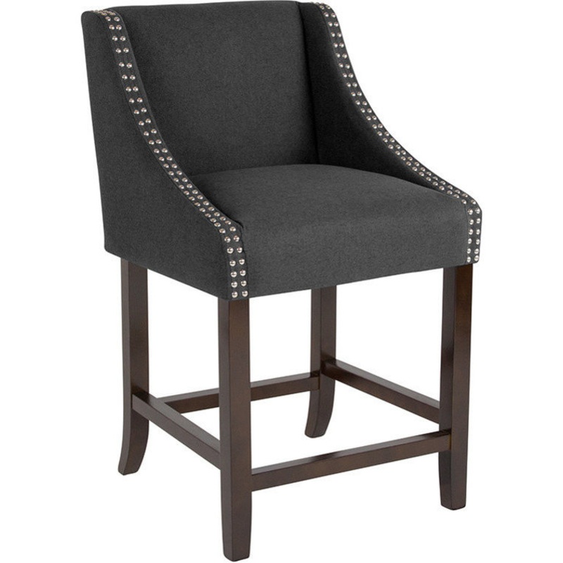 This classically sophisticated upholstered counter stool with decorative nail trimming lend a touch of old world elegance and comfort. The solid wood frame and legs are streamlined with a touch of whimsy mimicking the curved design details of the arms. The
