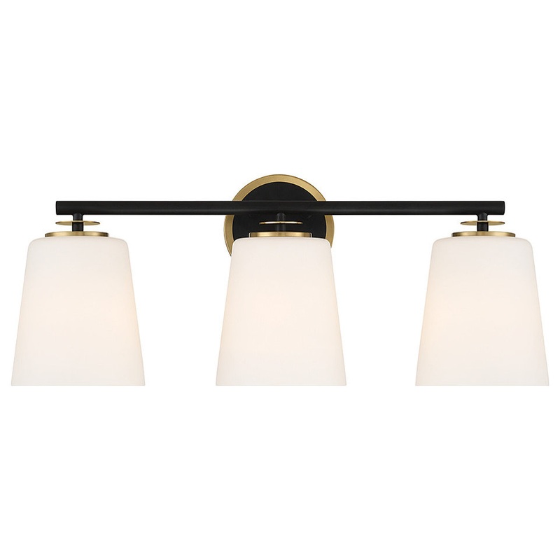 Add classic, elegant illumination to the bath with this 3-light bath bar! Cone-shaped shades of white opal glass will bring a bright yet comfortable glow. When paired with the Matte Black and Natural Brass finish, it's a fabulous look. 9.25" height, 24" wi