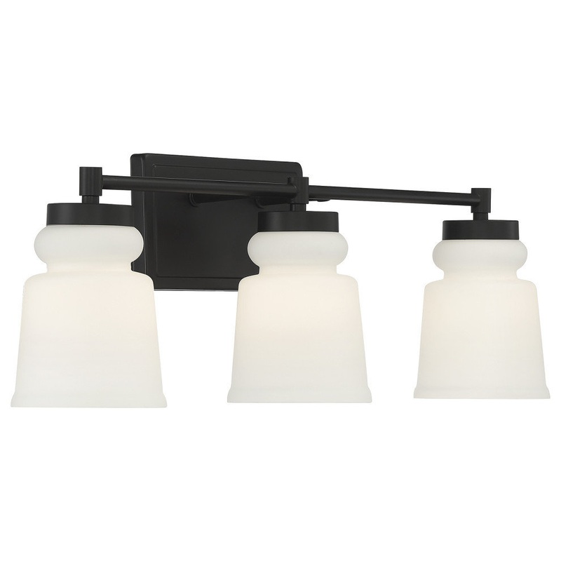 Simply stylish and cleanly classic, this 3-light bath vanity bar showcases vintage-inspired shades of milk glass and a matte black finish for bright yet comfortable illumination. 8.50" height, 24" width, extends 6" from wall. Max 60 watts per bulb, standar