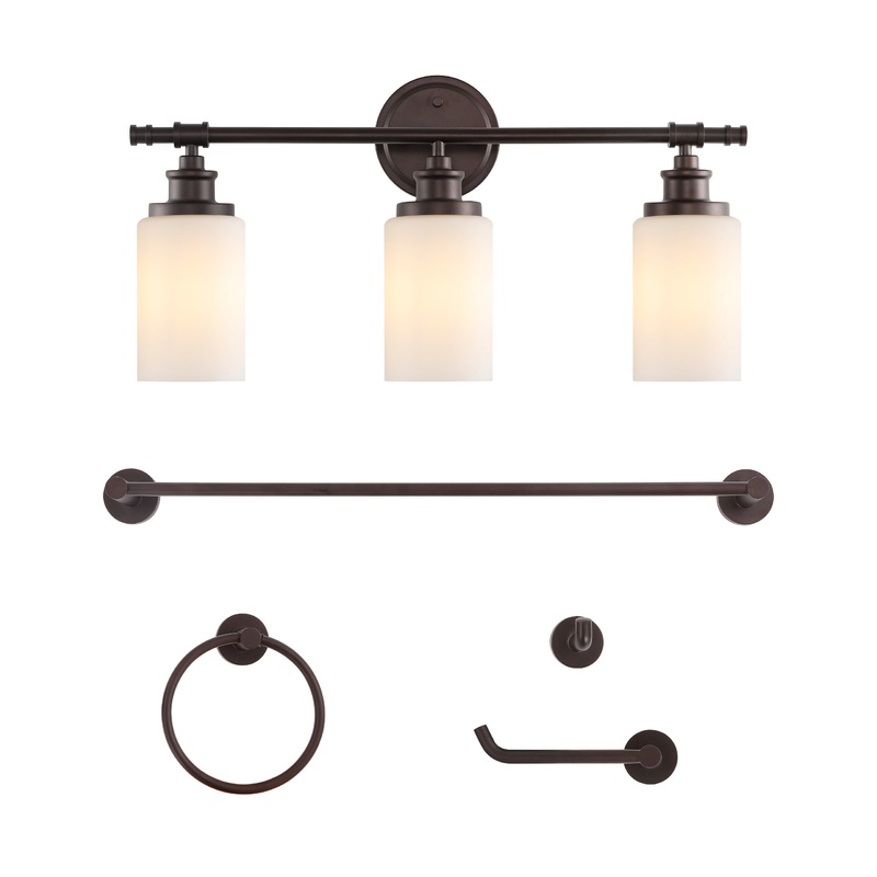 -5-piece bathroom set includes a vanity light, towel bar, towel ring, toilet roll holder, and robe hook