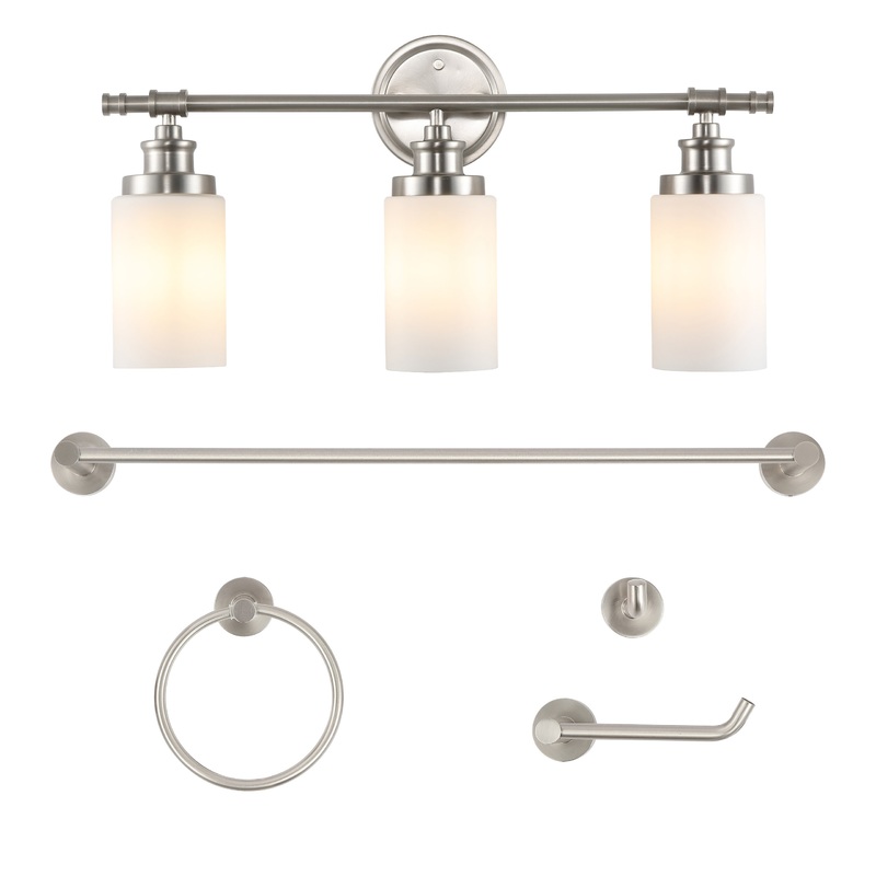 -5-piece bathroom set includes a vanity light, towel bar, towel ring, toilet roll holder, and robe hook