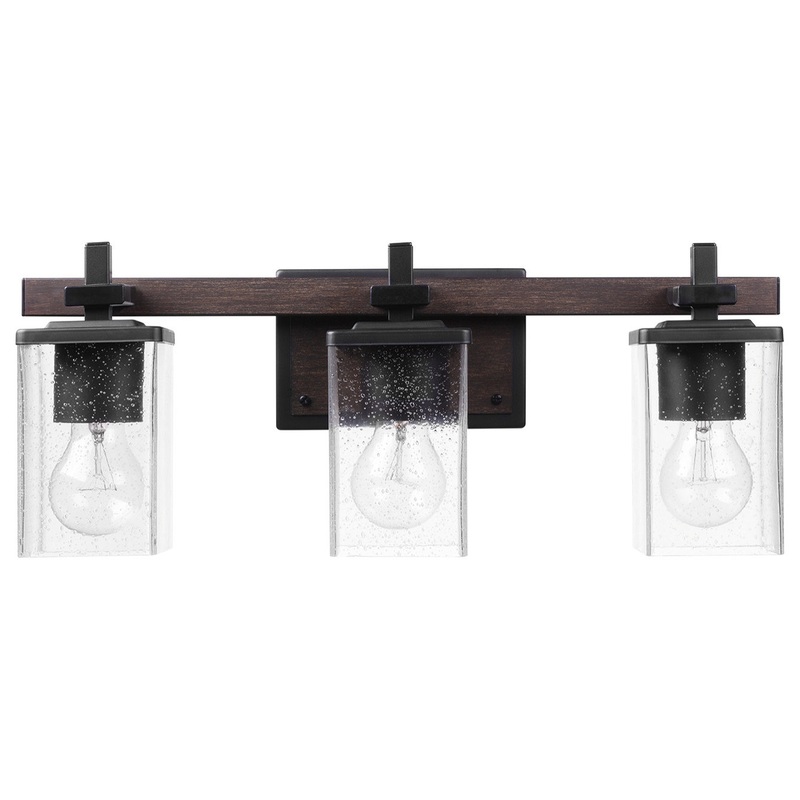 Perfect for adding the right amount of light to any space, the Dakota 3-Light Vanity Light is an ideal choice for any room in your home particularly in your bathroom over your mirror or your bedroom in a makeup or getting ready area. With elements of industrial, modern and retro, a matte black finish completes the well crafted design. Square accent pieces add a distinctive visual element while the rectangular seeded glass shades showcase the bulb of your choice letting you change the feel of your light as often as you want. Since it uses standard E26 base bulbs, the options are endless. Plus, you can place the vanity with the shades pointing up or down depending on the space you need to light.