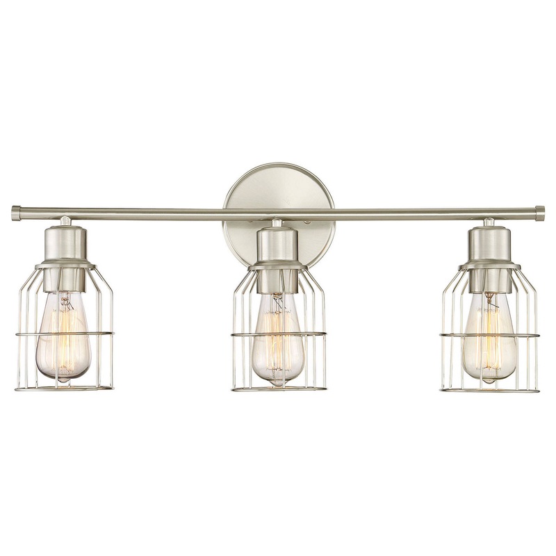 This industrial-style three-light vanity fixture offers thin wire cage shades over exposed light sources and a brushed nickel finish.