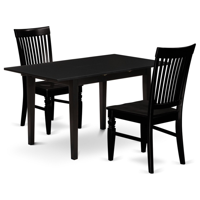 -Our lovely Rectangular dinette set contains an attractive kitchen dining table and 2 wonderful wooden dining chairs. Our modern dining chairs are consisting of a wooden seat and the back is slatted. This butterfly leaf wood dining room table has a Black Rectangular top and Black 4 legs. This classic wood dining chair and the table is ideal for any dining area.