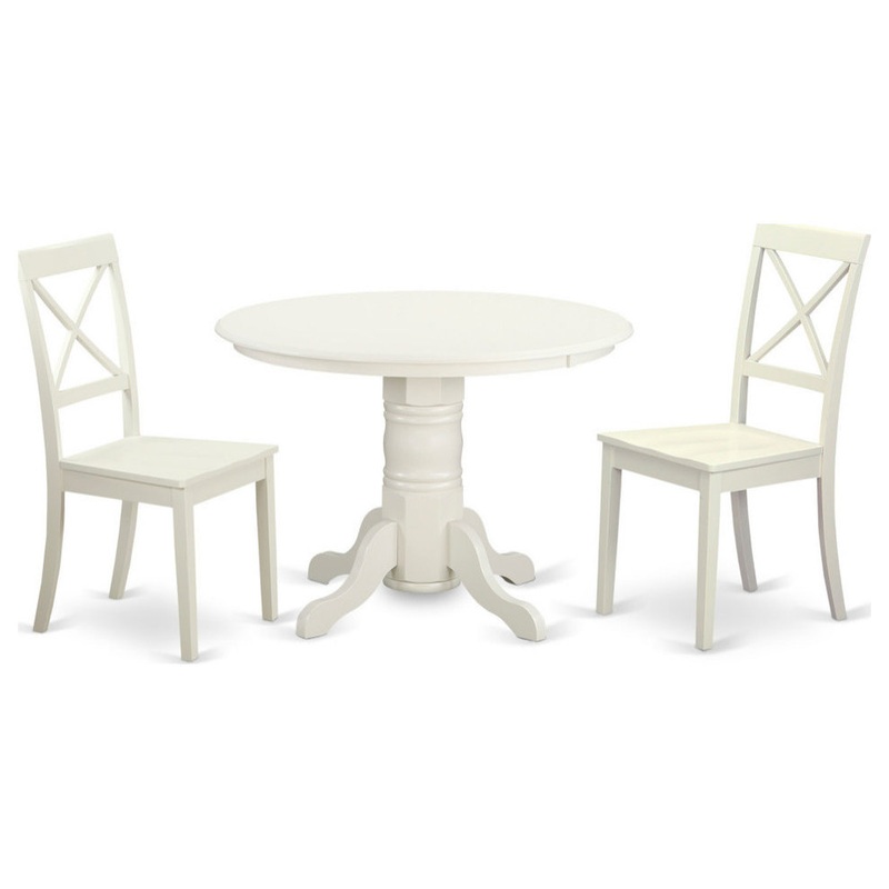 Lighten up a dining area or generate a comfortable dining space in a kitchen with this type of 3 piece dining table set. This set consists of a round pedestal table and 2 sheaf back style dinette chairs. The Linen White finish adds an excellent country cottage or shabby chic look to any dining room or kitchen space. This round table is great for kitchens or dining rooms. Its compact size makes it suitable for apartments, condos or other small spaces.