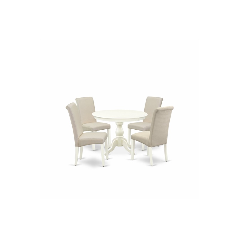 -This Pedestal dining room table top color and finish is Linen White. The modern chair seat color is cream and the legs are also finished in Linen White. An attractive alternative to classic chairs, these kitchen chairs are perfectly made to match any decor. Our color schemes very easily blend with any decor and provide a refined aesthetic.