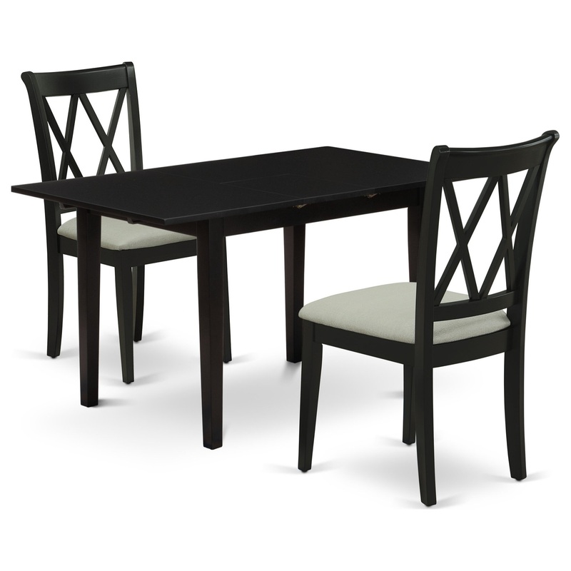 -Our wonderful wood dinette set includes an attractive mid century dining table and 2 attractive dining chairs. Our dining room chairs are consist of a Linen Fabric seat and the back is double X. This butterfly leaf kitchen dining table has a Black Rectangular top and Black 4 legs. This conventional wooden dining chairs and the wood dining table is perfect for any living area.