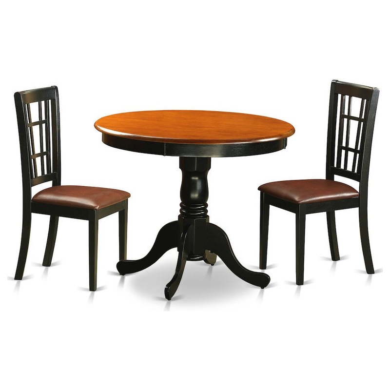 -This 3 piece dinette set Includes dining table and 2 faux leather seat dining room chairs finished in Black & Cherry.