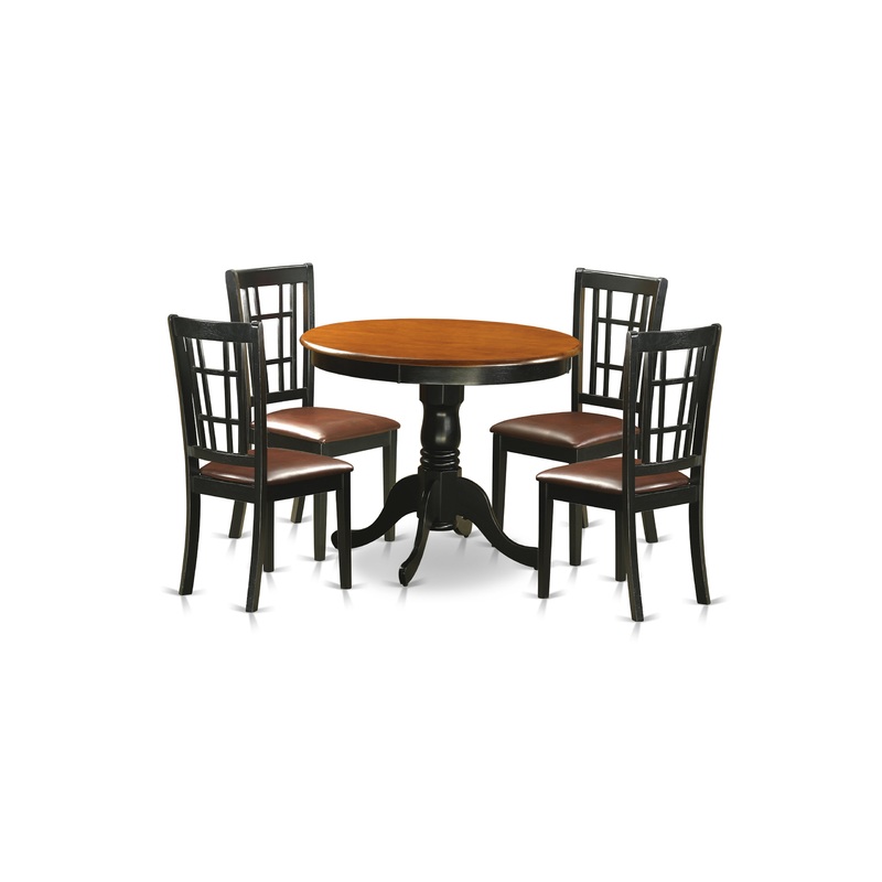 -Our Mid-Century Dining Table Set benefits cozy Faux Leather seat and Pedestal legs, the frame of these dining chairs and the gorgeous dining table is built from premium quality black Finish wood, which creates the perfect quality color Combination to give a high-class gaze to your kitchen.
