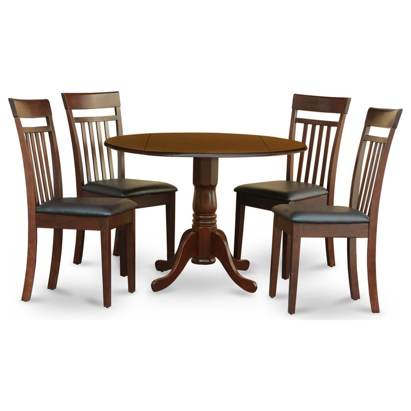 -Magnificent modern dining table set color is Mahogany thats a reason round dining table set matches easily to any kitchen dcor and delivers the kitchen a fantastic appearance. We have painted this set with the help of expensive and irremovable colors. Our dining room chair seat is created from Faux Leather which provides excellent sitting experience.