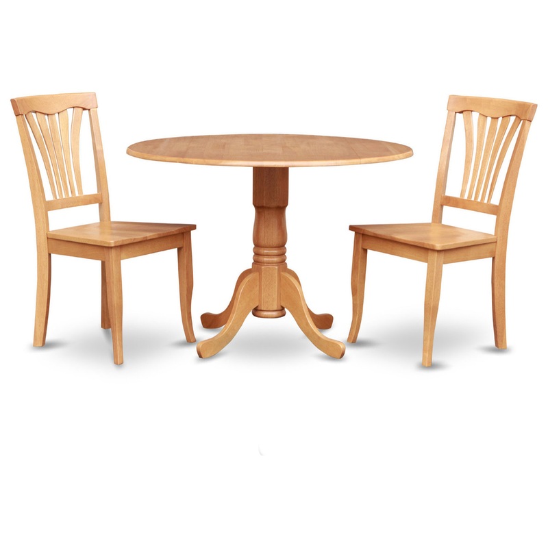 -Its beautiful dining room set consists of a stunning pedestal table and 2 marvelous wood dining chairs. Our fabulous kitchen dining chairs have 4 wooden legs and a slatted back. This kitchen dining table consists of a round top, pedestal legs and two 9-inch drops leave that will improve the grace of your dining-room. You can create your dining area attractively and get elegant charm by adjusting our round dining table set there.