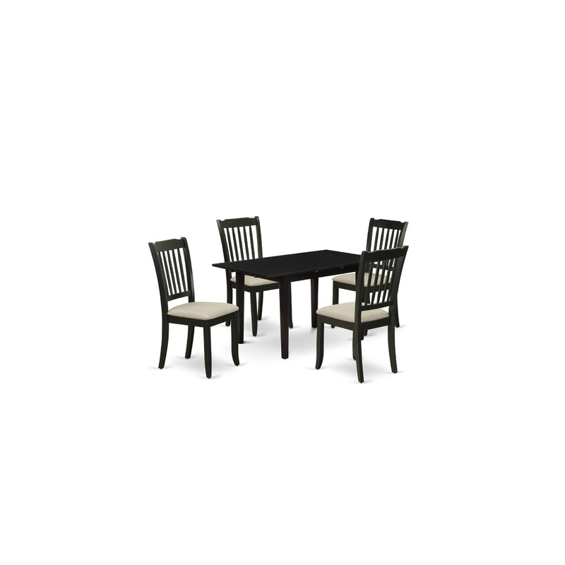 -The stunning dining room set contains an attractive rectangle dining table and 4 amazing dining chairs. Our dining chair is consisting of a Linen Fabric seat and the back is slatted. This butterfly leaf rectangular table has a Black Rectangular top and Black 4 legs. This classic dining chairs and the small dining table is suitable for any living area.