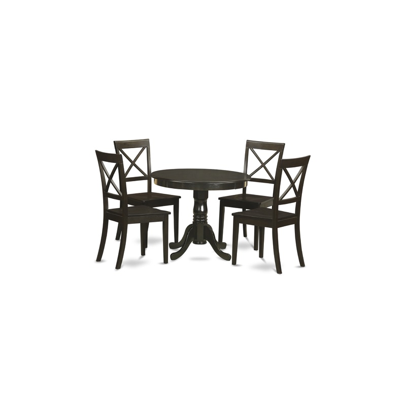 Classic Cappuccino round dinette set offers an extraordinary lovely color to supplement any dining area or kitchen area for all gatherings. A thick curled ornate pedestal base gives toughness and state-of-the-art impression to the round small dining table. This excellent round small table set will bring the room together as it lures with is clean design. Clean shiny satin finish table top, This specific small dining table measures: W36 Round, H30. Just the right measurement for big and small kitchen. The dinette chairs come with slatted backs and your option of dining room chair seats in either wood , upholstered, and last of all padded to match taste and desired design. Built out of hardwood, this valuable dinette set is heavy duty and well-performing that will certainly last a long time.