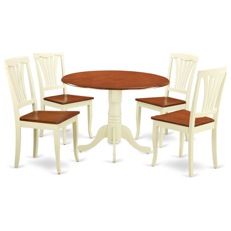 -Our wonderful wood dining table set consists of an attractive modern dining table and 4 delightful kitchen chairs. Our fantastic dining room chair has 4 wooden legs and a slatted back. This kitchen table consists of a round top, pedestal legs and two 9-inch drops leave that will enhance the charm of your dining room. You can create your dining room beautiful and get elegant charm by adjusting our dinette set there.