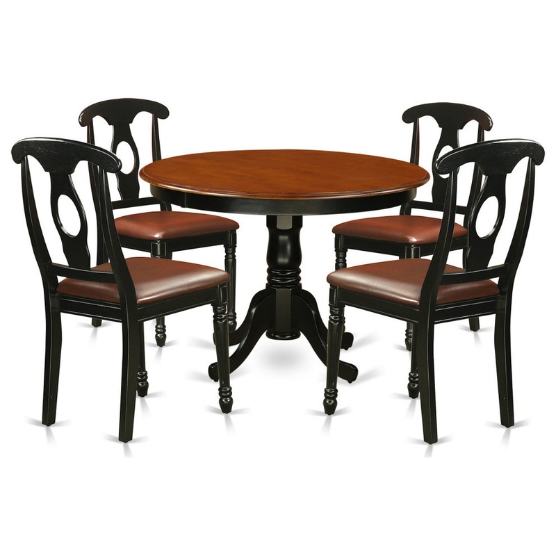 This Specific Circular Small Table Set Will Definitely Apply A Lovely Feel To The Dining-Room Because Of Its Dark Refined Elements. The Circular Table Boasts A 42” Width, A 30” Height, Plus A Little More Space For That Extra Dinner Guests. The Entire Stylized Dining Chairs Have A Relatively Horizontal Back slats, For That Fairly Simple But Harmonious Decor. The Round Small Kitchen Table Plus Matching Black Dining Room Chairs Give You An Abundance Of Comfort Not To Mention Giving You That Sharp Finish. The Circular Dining Room Tables Includes A Detailed Stand Which In Turn Branches Apart Into Four Curved Legs For Appearance And Structural Reinforcement. 5 Piece Hartland Set With One Round 42in Kitchen Table And Four Dinette Chairs With Leather Seat In A Black White Finish