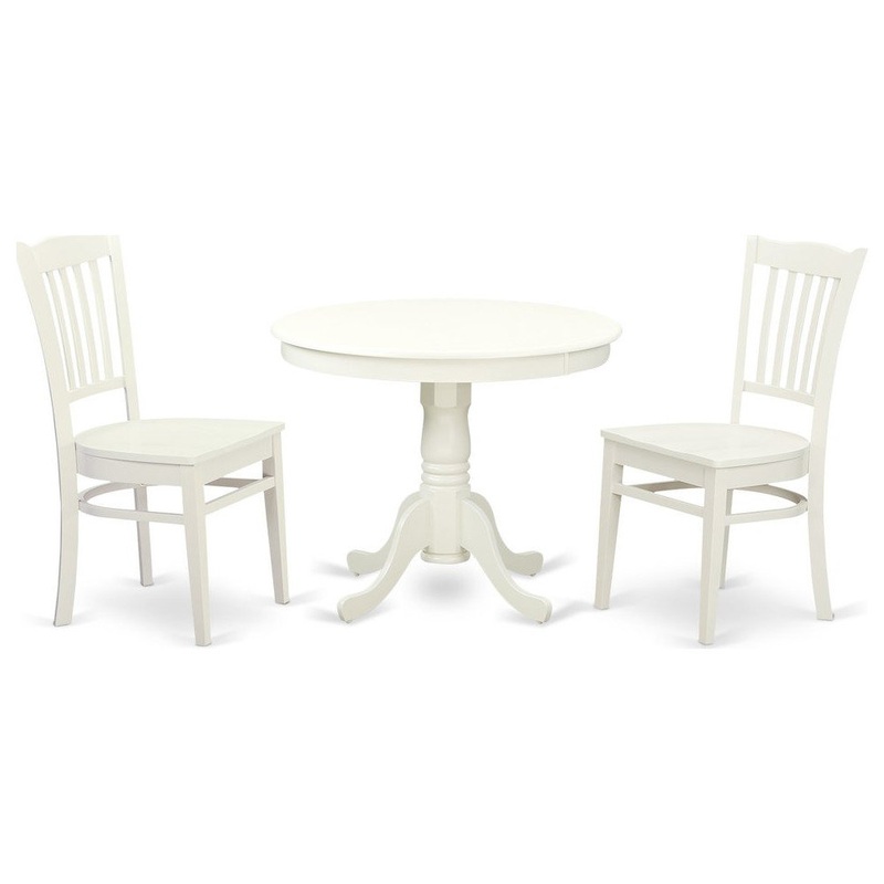Dazzling Antique Dinette Table Set Gives Fashion To Every Dining Area Or Breakfast Nook. This Beautiful Table And Dining Chairs Set Is Finish In A Rich Linen White Color. This 36 Inch Round Tabletop With Beveled Edges Is Glorious Enough To Present Fine China And Durable Enough For A Family Barbecue. Sustained By A Graceful 30 Inch Pedestal Stand That Features Four Elegantly Created Legs. Gorgeous, Slatted, High Backed Kitchen Dining Chairs Feature Flowing Shape From Top To Bottom And Stylish Showing. 3-Piece Set With One Table And 2 Solid Wood Seat Dinette Chairs In A Rich Linen White.