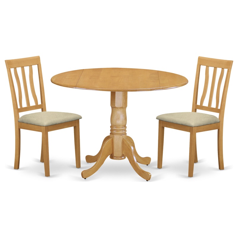 -Our wonderful round dinette set consists of a lovely dinner table and 2 wonderful wooden chairs. Our great dining room chair has 4 wooden legs and a slatted back. This dining table consists of a round top, pedestal legs and two 9-inch drops leave that will improve the beauty of your dining-room. You can make your dining room attractive and get elegant charm by adjusting our kitchen table set there.