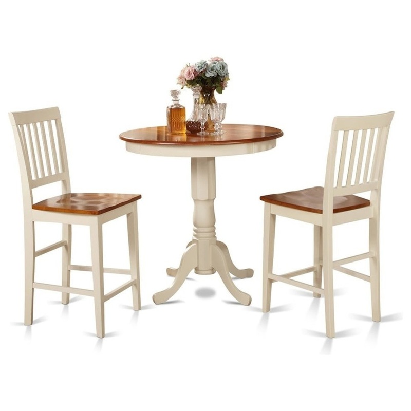 This unique circular counter height sets will grace any kitchen space. Circular gathering table and bar stools are superb for kitchen use since this sets are efficient.Two tone kitchen table with brown table top and Linen White legs. Splendid circular counter height dining table should fit perfectly in all home, dining room. Tough wood seats kitchen bar stool are generally suitable for house usage..Vertical back style counter height stool would certainly make impression on your guess featuring its sophisticated yet contemporary style. Table Dimensions: Length 36; Width 36; Height 36, Chair Dimensions: Length 18.5; Width 17; Height 42