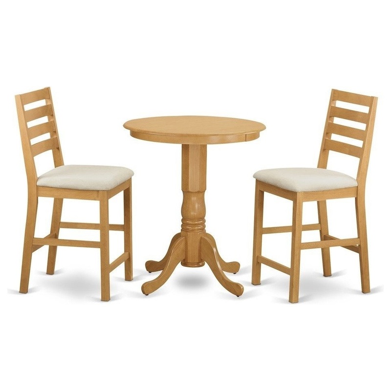 -Fabric: MicrofiberPackage Includes: 3 Piece Small counter height round kitchen table with Two solid wood bar stools finish in a warm oak color with microfiber upholstery seat.