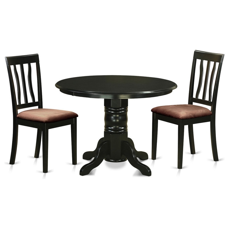 -Package Includes: 3 piece Shelton round kitchen table 42in Diameter with 2 Antique Dining Chair With Microfiber Seat in a Black Finish.