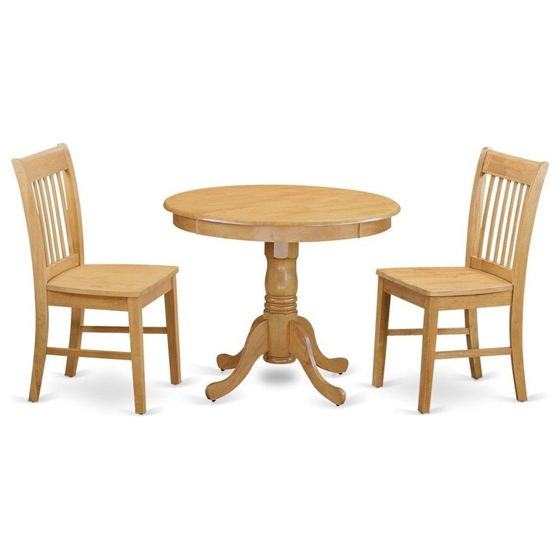 -Package Includes: 3 Piece Small round kitchen table with a pair of kitchen chairs finish in a warm oak color with wood seat.