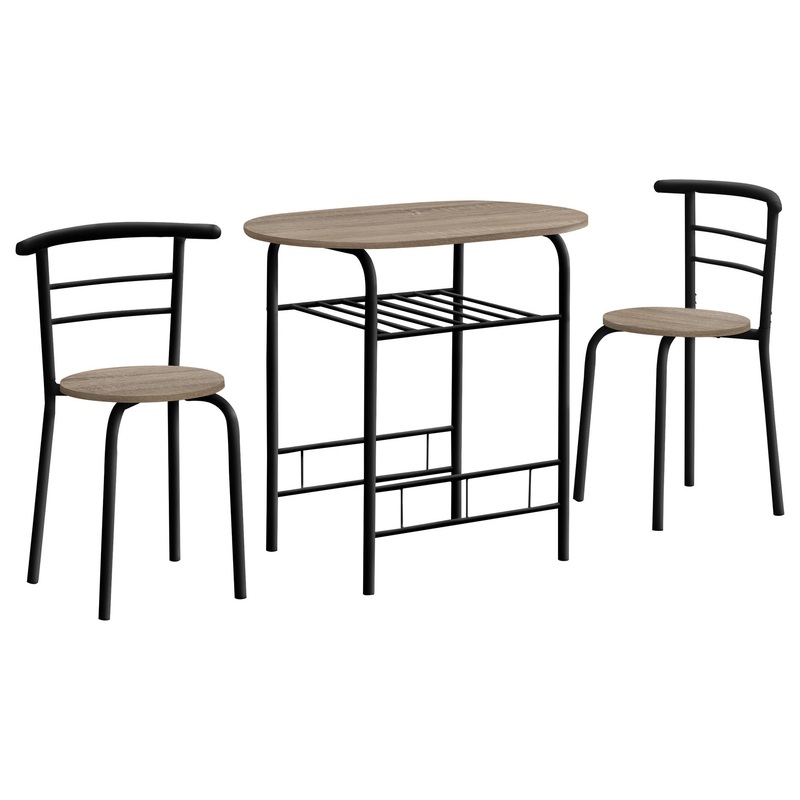Create a compelling and cohesive aesthetic in your space with this three-piece dining set which includes one table and two chairs. Perched atop curved metal legs the oval table is crafted from manufactured wood while the two chairs feature a ladderback des