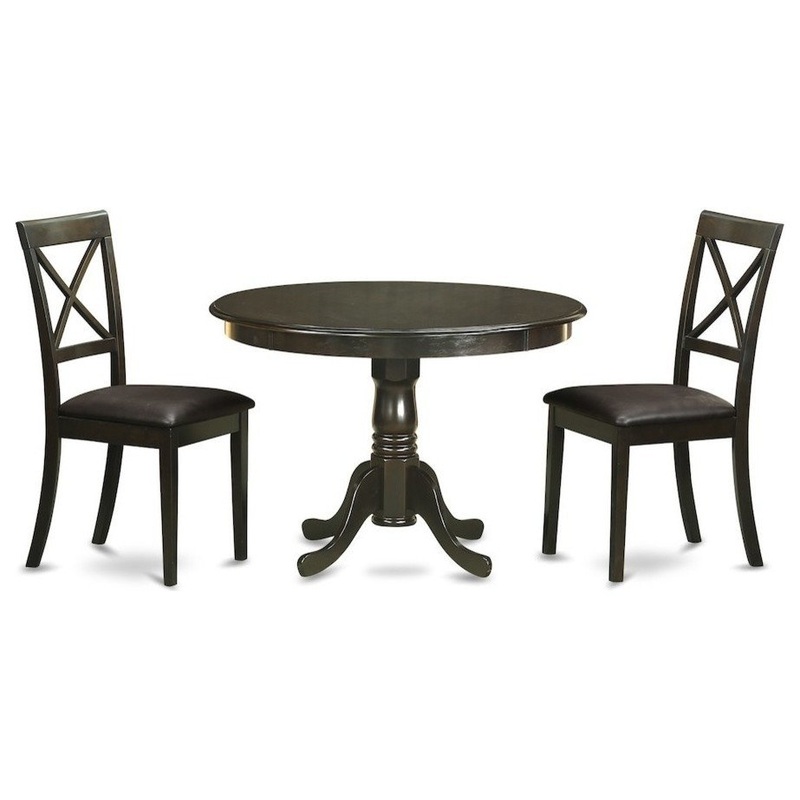 -Fabric: Faux leatherPackage Includes: This 3 piece dinette kitchen table set includes one dinette round table 42 in dimension with 2 Drop Leaves and 2 X back with faux leather seat chairs in an elegant Cappaccino finish.