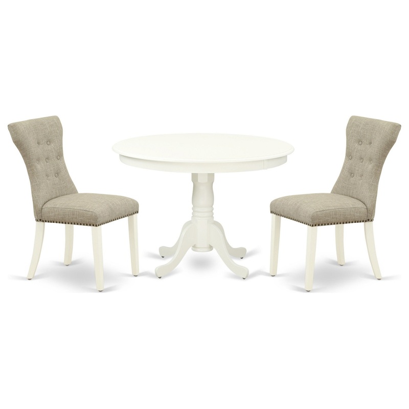 East West Furniture HLGA3-LWH-35 3-Pc Kitchen Dinette Set Included a Pedestal Dining Table & 2 Parsons Dining Room Chairs, Doeskin Linen Fabric Dining Chairs Seat with Rubber Wood Legs, Linen White Finish