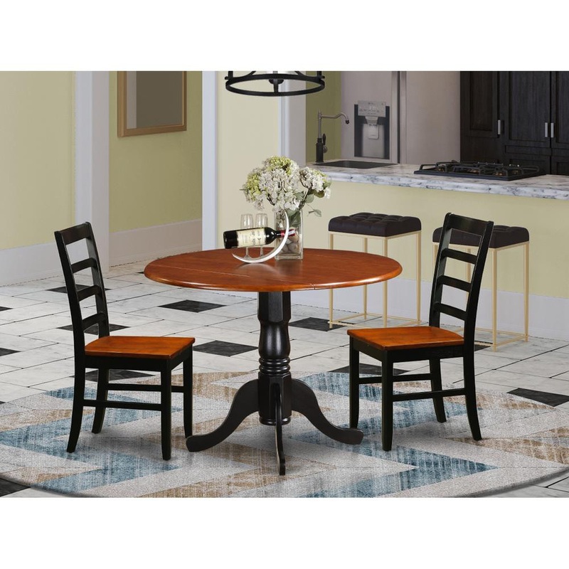 -Package Includes: This 3 piece dinette set Includes dining table and 2 wood seat dining room chairs finished in Black and Cherry