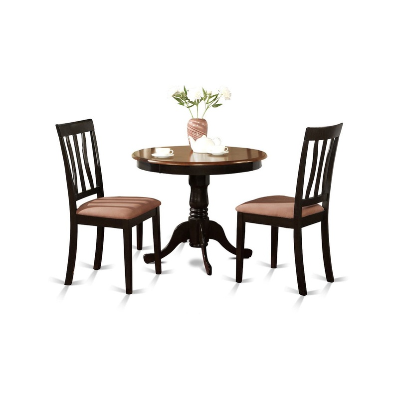 Glossy Antique small kitchen table set provides refinement to any kind of kitchen or your morning meal nook. Two tone dining tables with brown table top and Black legs. The 36 inch round tabletop with beveled sides is good looking enough to showcase fine china and sturdy enough to have a friends and family barbecue. Sustained by a lovely 29 inch pedestal which features four elegantly carved legs. Stunning, slatted, high backed dining room chairs provide graceful shape from top to bottom and stylish showing. Dinette chair seat come in either solid wood, cushion, and last of all faux leather with charming slatted back for your relaxation while you are having dinner on the dinette set.