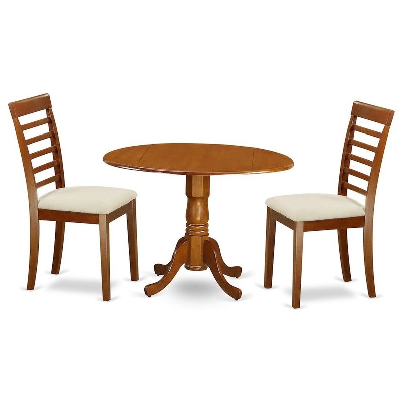 -Package Includes: 3 piece kitchen Round Table with 2 Drop Leaves and 2 Ladder back Chairs with Microfiber Upholstered Seat in a Saddle Brown finish