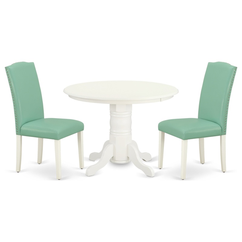 SHEN3-LWH-57 3Pc Round 42″ Dinette Table And A Pair Of Parson Chair With Linen White Leg And Pu Leather Color PondTurn your house into a home with this excellent and sophisticated SHEN3-LWH-57 kitchen dining set. Classic round kitchen dinette table offers a stunning Linen White color to enhance any kind of living area or home’s kitchen area for any occasions. A thick curled ornate pedestal base provides strength and state-of-the-art impression to the round dining room table. This gorgeous Linen White kitchen dinette table will bring the room together as it draws in with is glossy design. No heat treated pressured wood like MDF, particle board or veneer top fabricated. This amazing slick kitchen table makes a really good addition for all kitchen space and corresponds all sorts of dining-room concepts. This simple but charming Parson chair will add ambiance and style to your dining-room. A contemporary twist on a classic design, this eye-catching design will liven up any look. The traditional parson gives this chair a touch of familiar charm, while the PU Leather-Pond color and clean-lined design elevate this chair with modern flair. Replacing the old dining set with this one, you can effortlessly refresh your dining space. Straight legs gives this design a hint of well-worn style, while its arched silhouette and nail head trim round out the look with classic character. The frame of the dining chairs are engineered to offer a great amount of comfort to your spine and thus reduce the chances of back pain. This budget friendly dining set can be good choice for a great dining time experience with family and friends.Table Specifications: Material: Asian HardwoodColor: Linen WhiteDimensions: Length 42; Width 42; Height 30Weight Capacity: 300 lbsChair Specifications:Frame Material: Asian HardwoodFabric: PU LeatherCushion Material: FoamFabric Color: PondLeg Color: Linen WhiteDimensions: Length 23; Width 18; Height 40Weight Capacity: 300 lbsIncludes:1 x Round Table2 x Parson ChairN.B.: Hardware package and instruction manual is located in/under the seat.