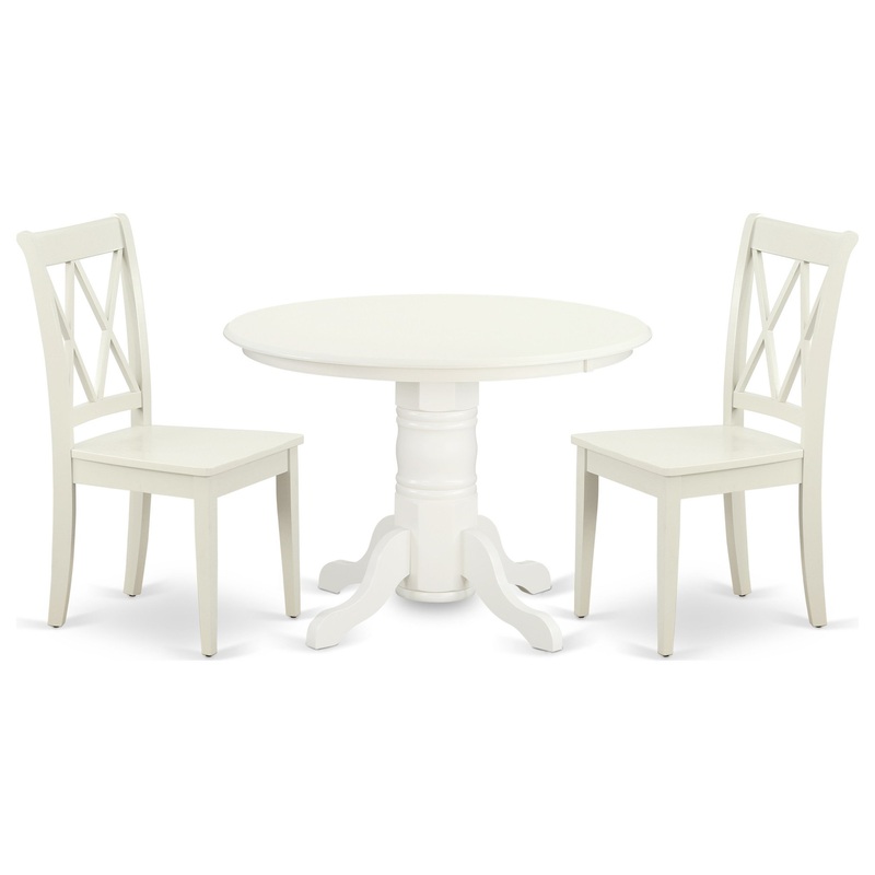 SHCL3-LWH-W 3PC Round 42 inch Table and 2 Double X back ChairsTurn your house into a home with this excellent and sophisticated SHCL3-LWH-W kitchen set. Classic round kitchen dinette table offers a rich stunning Linen White color to enhance any kind of living area or home’s kitchen area for any occasions. A thick curled ornate pedestal base provides strength and state-of-the-art impression to the round dining room tables. This valuable Linen White kitchen dinette table will bring the room together as it draws in with is glossy design. Slender Double X back kitchen chairs finished in rich Linen White color with wood seats present fashionable and cozy seating. Made up of hardwood, the chair is stable and offers a sturdy finish. The chairs add elegance and class to any place you have placed them. The frame of the chairs are engineered to offer a great amount of comfort to your spine and thus reduce the chances of back pain. The matching color of the chair with the table brings a good contrast in the kitchen area. The standard shape, size and design makes the dining area significantly attractive. This contemporary, budget friendly, durable and comfortable dining set can be good choice if you are looking for a great dining time experience with your family or friends.Table Specifications: Material: Asian HardwoodColor: Linen WhiteDimensions: Length 42; Width 42; Height 30Weight Capacity: 300 lbsChair Specifications: Material: Asian HardwoodColor: Linen WhiteDimensions: Length 21; Width 18; Height 38Weight Capacity: 300 lbsIncludes: 1 x Round Table2 x Wooden ChairN.B.: Hardware package and instruction manual is located in/under the seat.