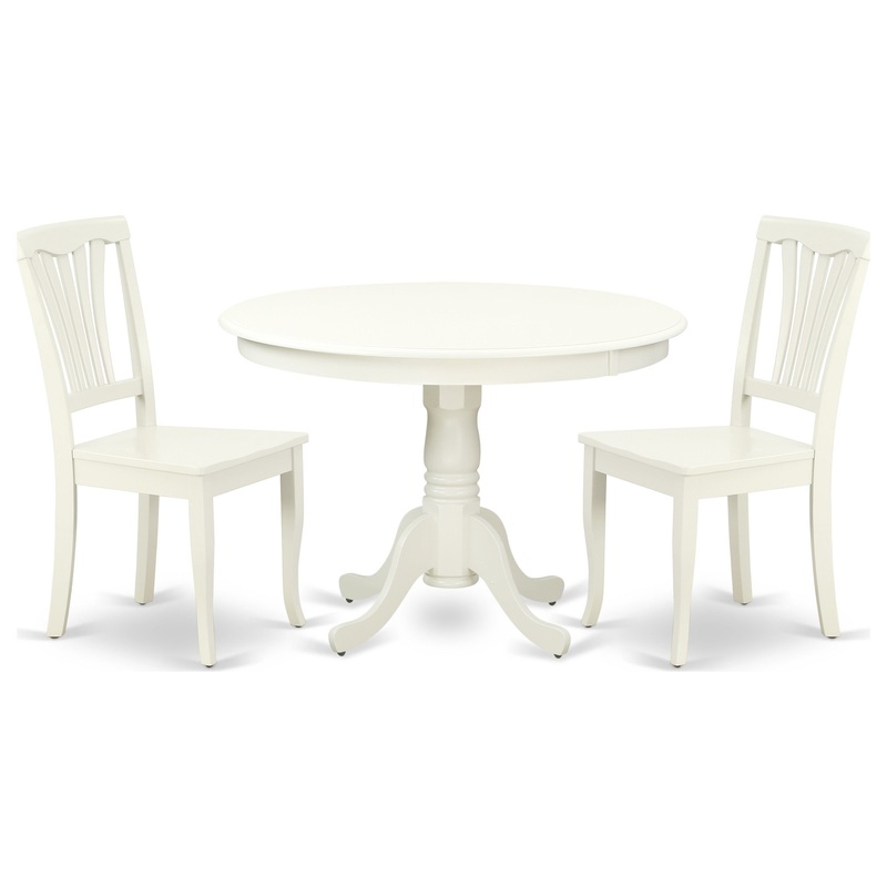 HLAV3-LWH-W 3PC Round 42 inch Table and 2 vertical slatted ChairsThe HLAV3-LWH-W dining set provides a distinct, sleek Linen White finish well-fitted to any sort of home decoration style. The fresh and clean lines dominate the cutting-edge design of the oval kitchen dinette table of this valuable kitchen set. To complement the kitchen dinette table’s round beveled tabletop, the comfy Linen White finish provides you the glimmer and shadows on the small kitchen table’s pedestal with distinct contours and ridges for an antique dining room table set. The kitchen set provides you with subtle and cleanly made dining chairs made out of solid wood. This small dining table require a very less space and it d be a great choice if you are struggling with the issue of space in your house. The particular dining chairs present fashionable and comfy seating, with Wooden seats which let you enjoy a nice and trendy dining experience. Made up of hardwood, the chair is stable and offers a sturdy finish. The chairs add elegance and class to any place you have placed them. The frame of the chairs are engineered to offer a great amount of comfort to your spine and thus reduce the chances of back pain. The matching color of the chair with the table brings a good contrast in the kitchen area. The standard shape, size and design makes the dining area significantly attractive. This contemporary, budget friendly, durable and comfortable dining set can be good choice if you are looking for a great dining time experience with your family or friends.Table Specifications: Material: Asian HardwoodColor: Linen WhiteDimensions: Length 42; Width 42; Height 29.5Weight Capacity: 300 lbsChair Specifications: Material: Asian HardwoodColor: Linen WhiteDimensions: Length 22; Width 18; Height 36Weight Capacity: 300 lbsIncludes: 1 x Round Table2 x Wooden ChairN.B.: Hardware package and instruction manual is located in/under the seat.