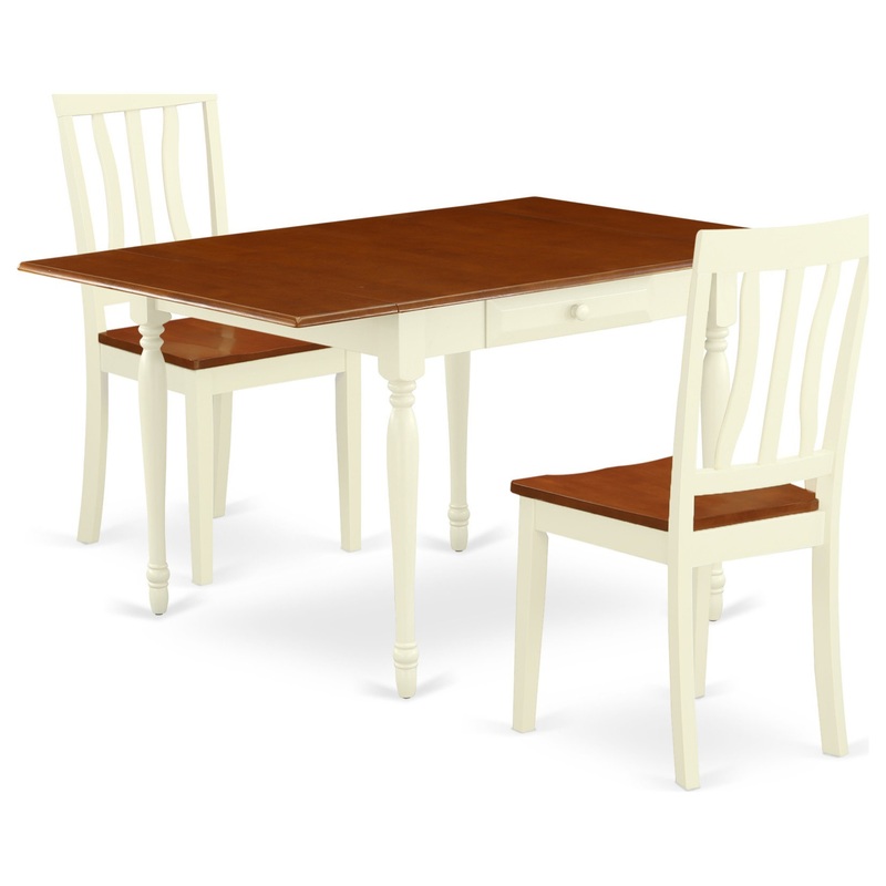 East West Furniture MZAN3-WHI-W 3Pc Dinette Set Consists of a Rectangle Table and 2 Modern Dining Chairs with Solid Wood Seat, Drop Leaf Table with Slat Back Chairs, Buttermilk and Cherry FinishFurnish your kitchen area with this sophisticated MZAN3-WHI-W wood dining table set to get an amazing and fancy appearance. Crafted in the transitional style for your casual kitchen area, the dining set will be a welcome area for your loved ones to gather during meals and social activities. The convenient 3 pieces dining room table set consists of a small kitchen table and two dining chairs. Manufactured from Asian tropical hardwood also known as rubberwood, the modern dining table finished in Buttermilk and Cherry has smooth edges and fashioned round legs for a fancy style. The drop leaf table integrates two 9-inch drop down leaves that provides additional space for extra food trays and drinks. The 2 drawers of the dining table provide additional storage to help keep you organized. The kitchen table can be assembled without any extra tools and aim to last for long. The stunning dining room chairs offer a hardwood top to get an exquisite and modern look. These kitchen chairs come with a solid wood seat to fit personal preference and perfect design. The 3 vertical slats give any kitchen area a touch of class and sophistication. Made up of solid wood, the dining chairs set of 2 is stable and offers a sturdy finish. The frame of the wooden dining chairs is engineered to offer a great amount of comfort to your spine and thus reduce the chances of back pain. The matching color of the wood dining chair with the table brings a good contrast in the kitchen area. The standard shape, size and design make the dining area significantly attractive. This contemporary, affordable, durable and comfortable dining set can be a good choice if you are looking for a great dining time experience with your family or friends. Table Specifications: Material: Asian Hardwood Color: Buttermilk and Cherry Dimensions: Length 36 extendable to 54; Width 36; Height 30 Chair Specifications: Material: Asian Hardwood Cushion Material: Foam Color: Buttermilk and Cherry Dimensions: Length 21; Width 17; Height 36 Weight Capacity: 300 lbs Includes: 1 x Rectangular Table 2 x Wooden Chair N.B.: Hardware package and instruction manual is located in/under the seat.