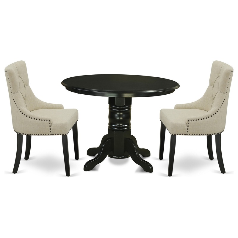 SHFR3-BLK-02 3Pc Dinette Set Includes a Round Dining Room Table and Two Parson Chairs with Light Beige Fabric, Black FinishTurn your house into a home with this exclusive and sophisticated SHFR3-BLK-02 kitchen dining set. The classic round dinette table of