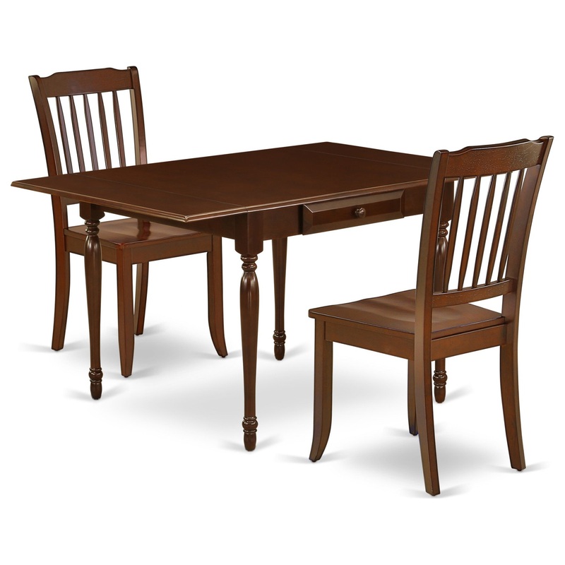 East West Furniture MZDA3-MAH-W 3Pc Dinette Set Consists of a Wood Dining Table and 2 Kitchen Chairs with Wooden Seat, Drop Leaf Table with Slat Back Chairs, Mahogany FinishDecor your dining room with this fashionable MZDA3-MAH-W dining table set for 2 to achieve a modern and fancy appearance. This exclusive dining table set for 2 offers a stylish appearance to enhance any sort of kitchen area or home’s dining space for any functions. The suitable 3 pieces dining table set includes a small table and two dining chairs. The rectangle-shaped wooden table finished in Mahogany is created from top-rated quality rubberwood known as Asian hardwood. The wood table integrates two 9-inch drop down leaves that provides additional space for extra food trays and drinks. The 2 drawers of the dining table provide additional storage to help keep you organized. The easy to assemble wood table ensures comfort and long-lasting use. The eye-catching Danbury dining room chairs finished in Mahogany color offers a modern look in your dinette space. The dining chairs set comes with a solid wood seat to fit personal preference and perfect design. The Stylish modern dining chairs feature curved front legs. The 7 vertical slats give any dining area a touch of class and sophistication. Made up of hardwood, the dining chairs are stable and offer a sturdy finish. The wooden dining chairs add elegance and class to any place you have placed them. The frame of the kitchen chairs is engineered to offer a great amount of comfort to your spine and thus reduce the chances of back pain. The matching color of the dining room chairs with the rectangular table brings a good contrast in the kitchen area. The standard shape, size and design make the dinette area significantly attractive. This contemporary, budget-friendly, durable and relaxing kitchen table set can be a good choice if you are looking for a great dining time experience with your family or friends. Table Specifications: Material: Asian Hardwood Color: Mahogany Dimensions: Length 36 extendable to 54; Width 36; Height 30 Chair Specifications: Material: Asian Hardwood Color: Mahogany Dimensions: Length 21; Width 18; Height 38 Weight Capacity: 300 lbs Includes: 1 x Rectangular Table 2 x Wooden Chair N.B.: Hardware package and instruction manual is located in/under the seat.